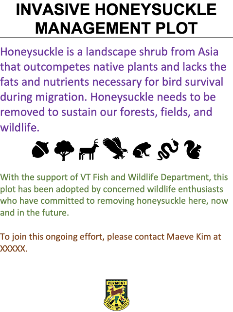 We got some good advertising from a small piece in Seven Days. And we got some heartening and encouraging comments from other members of the Vermont birding community, including an offer to buy the honeysuckle warriors a tool or some snacks on our next event.
